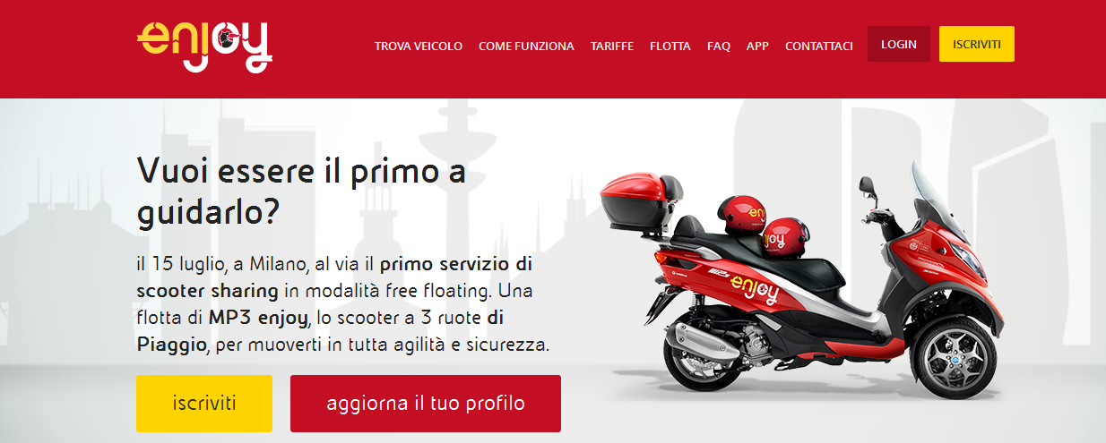 Milano è sempre più sharing. Da oggi infatti, dopo le biciclette e le auto, all’ombra della madonnina si potranno condividere anche gli scooter. A lanciare l’iniziativa è Enjoy, la società dell’ENI che poco meno di due anni fa era partita dal capoluogo lombardo con il servizio di car sharing basato sulle 500 di Fiat. Gli scooter messi a disposizione degli utenti al momento sono 150 MP3 di Piaggio ognuno dei quali è equipaggiato di due caschi. Per accedere al servizio, che costa 35 centesimi al minuto, bisogna avere almeno 21 anni e essere in possesso di una patente A o B.