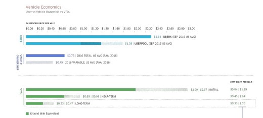 Volare con Uber? Secondo Business Insider Potrebbero mancare soltanto 10 anni. Non stiamo parlando degli elicotteri della società USA già operativi in alcune città come ad esempio Dubai, bensì di veri e propri avveniristici aeromobili. Questo è il quadro che emerge da un white paper reso disponibile dal celebre colosso della sharing economy. Lo studio che mostra come Uber sia alla continua ricerca di soluzioni innovative per migliorare il trasport è stato pubblicato oggi sul sito web della società californiana. Nelle 98 pagine che compongono il documento dal titolo “Fast-Forwarding to a Future of On-Demand Urban Air Transportation” viene spiegata e analizzata in ogni aspetto  quella che potrebbe essere la nuova frontiera degli spostamenti interurbani. L’idea di Uber è quella di progettare, realizzare e rendere effettivamente operativi entro il 2026 dei taxi aerei multi passeggero a decollo e atterraggio verticale spinti da un motore elettrico. Il nome di questi veicoli aerei è Vertical Take-Off and Landing – VTOL. Secondo lo studio pubblicato questi mezzi volanti potranno percorrere fino a 160 Km con una velocità massima pari a 240 Km/h. Nel documento sono anche contenute alcune immagini suggestive di questi concept aerei. Uber nel suo studio non ha tralasciato nessun dettaglio e ha analizzato anche l’investimento necessari per produrli è il costo per miglia. Quest’ultimo, in particolare viene comparato con il costo di un veicolo UBER e con quello relativo a un’automobile privata. Contro una media di un prezzo per passeggero per miglio di UberX  di 2,34 US dollari e di 1,38 US$ per UberPOP l’Uber Elevate potrebbe costare all’inizio in un range medio compreso tra 2,09 e 2,97 US$ che nel long term potrebbero abbassarsi tra un prezzo compreso tra gli 0,33 e i 0,37 dollari USA per passeggero per miglio volato. Considerando il prezzo nel med term il prezzo per miglio volato per passeggero si aggirerebbe intorno ai 0,50 dollari americani. L’analisi Uber mostra che il prezzo per un viaggio di 45 miglia su un VTOL, che dovrebbe sostituire un viaggio in auto di 60 miglia, potrebbe avere un costo a partire da US$ 21 per durata del viaggio di 15 minuti.
