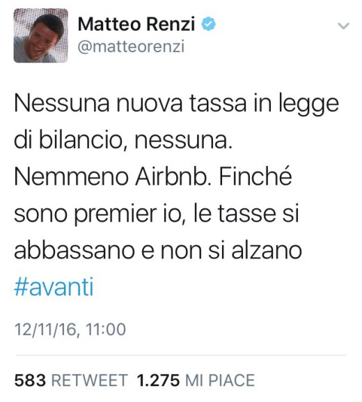 Dopo alcune indiscrezioni circolate nella serata di ieri in relazione una possibile nuova tassa sugli affitti brevi, vale a dire quelli intermediati sulle piattaforme di home sharing, l’affitto tra privati dell’era della sharing economy, tra cui Airbnb, è arrivata la presa di posizione del Presidente del Consiglio italiano tramite Twitter. “Nessuna nuova tassa in legge di bilancio, nessuna. Nemmeno Airbnb. Finché sono premier io, le tasse si abbassano e non si alzano #avanti”, ha scritto sul social Matteo Renzi. Per i proprietari di case e stanze in affitto sulla piattaforma, si era parlato di una tassazione al 21% dovuta all’applicazione di una cedolare secca. La proposta di una nuova tassa di questo tipo era contenuta in un emendamento del Pd (il partito di maggioranza) alla prossima legge di bilancio approvato nelle ultime ore dalla Commissione Finanze della Camera dei Deputati ed ora destinato a essere sottoposto alla Commissione Bilancio. La norma prevede, o prevedeva visto il secco stop del Primo Ministro, anche l’istituzione di un apposito registro all’Agenzia delle Entrate e di una clausola antievasione, con la responsabilità “in solido” sul pagamento delle tasse da parte del privato e dell’intermediario (Airbnb e sui simili). Lo stop dichiarato su Twitter da Matteo Renzi è certamente una buona notizia per quella parte, sempre più crescente, dell’Italia che guarda con favore a tutte le forme della sharing economy
