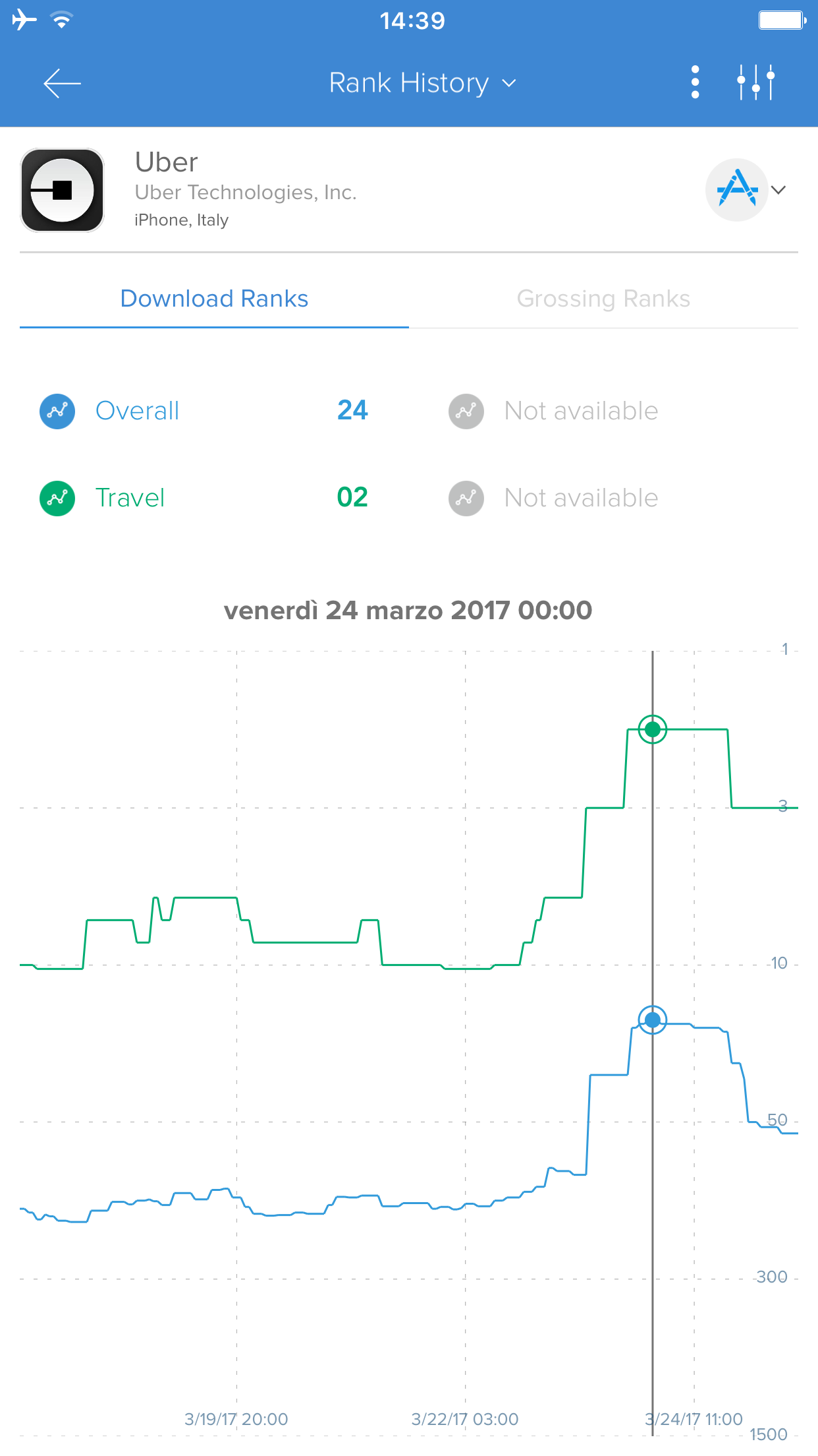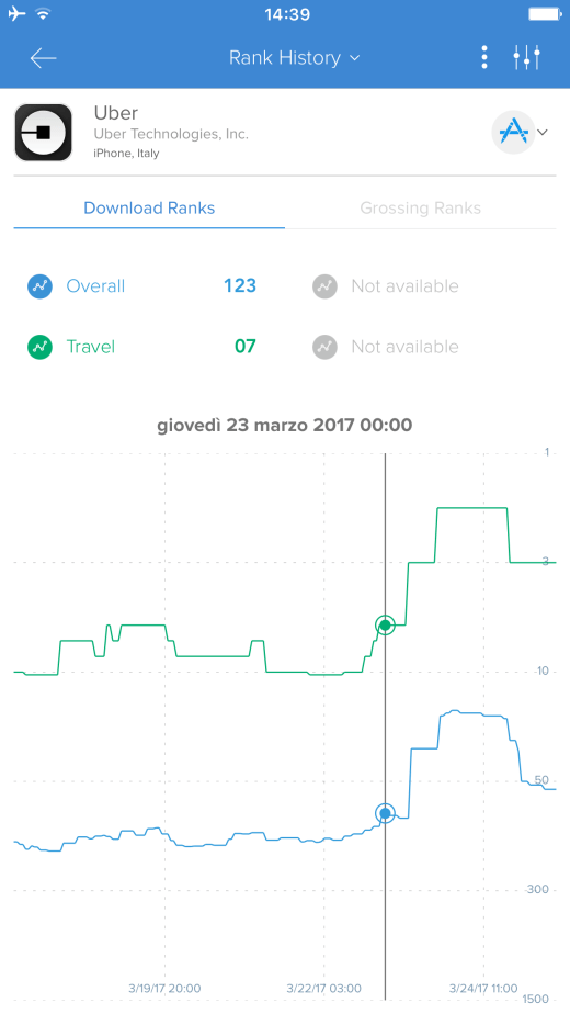 Andamento della App di Uber su smartphone iOS nel corso degli ultimi sette giorni – fonte Appannie