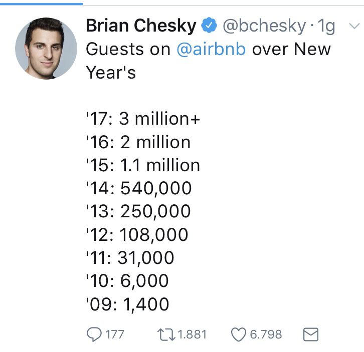 Airbnb, uno dei principali player della sharing economy, chiude il 2017 con il nono record consecutivo. Il celebre marketplace di home sharing ha aumentato di oltre un milione, rispetto allo scorso anno, il numero degli ospiti che hanno scelto un alloggio presente sulla propria piattaforma per la notte di Capodanno. Gli ospiti, i guest, per l’ultimo giorno del 2017 sono stati, infatti, oltre 3 milioni. Ad annunciarlo è stato Brian Chesky, CEO e fondatore di Airbnb ha da poco su Twitter che la società da lui guidata ha superato i Il numero degli ospiti per il capodanno 2017 rappresenta un aumento del 50% rispetto a quello dello scorso anno e quasi quattro volte quello registrato nel 2015. Airbnb, il leader dell’home sharing apre così nel migliore dei modi il 2018 che certamente sara un anno in cui lo sviluppo della sharing economy continuerà a livello mondiale. Happy Sharing New Year.