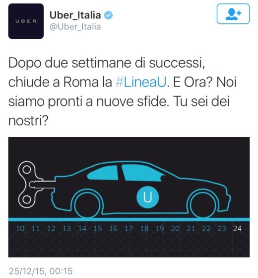 Ieri si è concluso progetto di mobilità partecipata della Linea U di Uber. L’idea era stata lanciata dal player della sharing economy a Roma in occasione dell’avvio del Giubileo. Linea U, rimasta attiva dalle 8 alle 20 dal 10 al 24 dicembre, ha messo in contatto 9 punti della città al costo fisso di 5 euro a corsa. Le fermate della Linea U sono state piazza Euclide, piazza Fiume, piazza dei Cinquecento (Termini), San Giovanni, Piramide, stazione Trastevere, Sant’Andrea della Valle, Castel Sant’Angelo e piazza Mazzini. Il percorso è stato il risultato della consultazione lanciata da Uber, tramite il sito web dedicato, www.linea-u.it.  Durante le due settimane di attività Linea U ha rappresentato per romani, turisti e pellegrini una valida alternativa agli altri servizi di trasporto urbano disponibili a Roma, visto anche che secondo alcuni studi in questa città nelle ora di punta solo il 28% della domanda complessiva di mobilità trova soddisfazione.