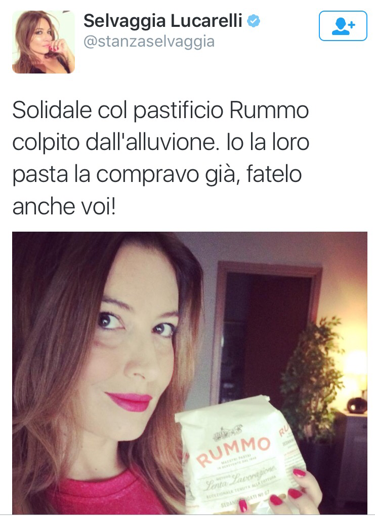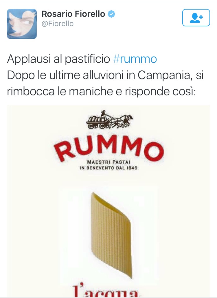Questa volta la sharing economy non c’entra nulla. Si parla di solidarietà al tempo dei social network. Su Facebook, Twitter e altri celebri piattaforme social nelle ultime ore è scattata una gara per manifestare solidarietà al pastificio Rummo e ai suoi 150 dipendenti gravemente colpito dall’alluvione che si è abbattuto sulla zona di Benevento la notte tra il 14 e il 15 novembre. L’iniziativa di solidarietà è partita da un “evento” promosso su Facebook in cui si invitano gli internauti a supportare la storica azienda di Benevento. Le mosse per sostenere una delle principali aziende del sud Italia sono poche e semplici: basta comprare un pacco di pasta, fotografarlo e poi condividere lo scatto sui social con l’hastag #saveRummo. All’appello al momento hanno aderito 41 Mila persone. L’azienda da parte sua ha diffuso uno statement in cui dichiara: “Basta guardare i volti degli operai per capire quanto sia grave quello che è successo”. A manifestare il loro sostegno anche alcuni personaggi noti come Selvaggia Lucarelli e Fiorello.